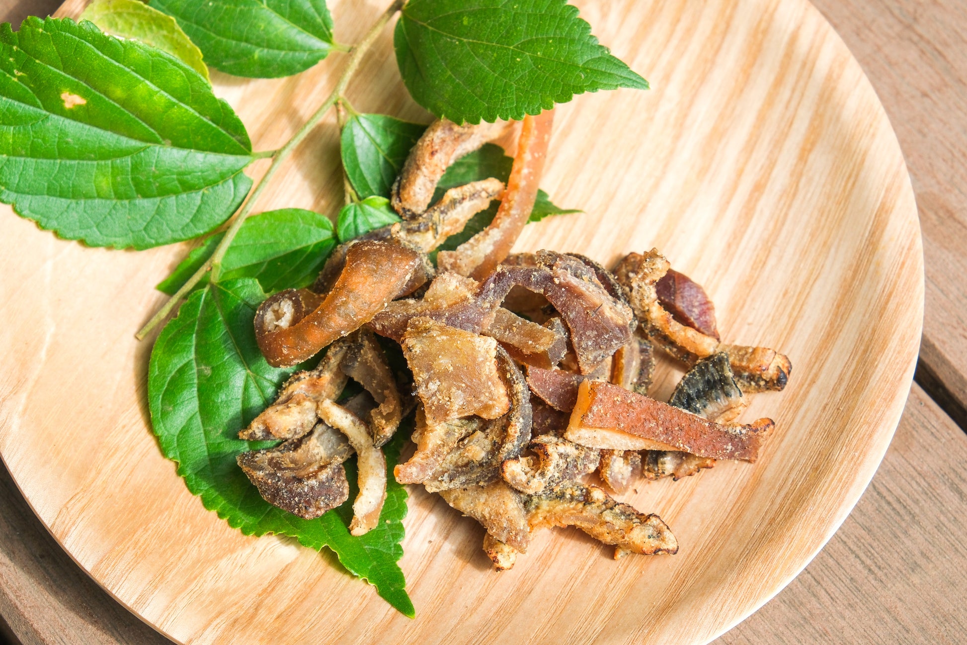 猪の皮をボイルし、細切りにして乾燥させてます。